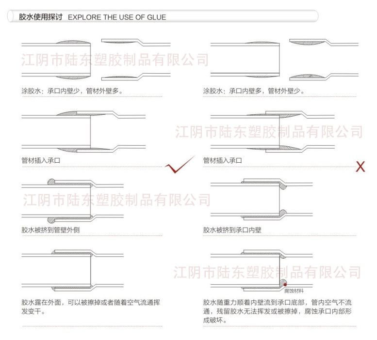 當(dāng)然,在本網(wǎng)站中,江陰市陸東塑膠制品有限公司已經(jīng)在之前的技術(shù)文獻(xiàn)里發(fā)表過圖示,正確涂抹膠水,安裝水管的對比圖,在這里,再次發(fā)布給做工程的同僚們看一下,加深印象,這樣在做PVC-U化工管件、UPVC工業(yè)管件這些對接操作的時候就不會有任何問題了。